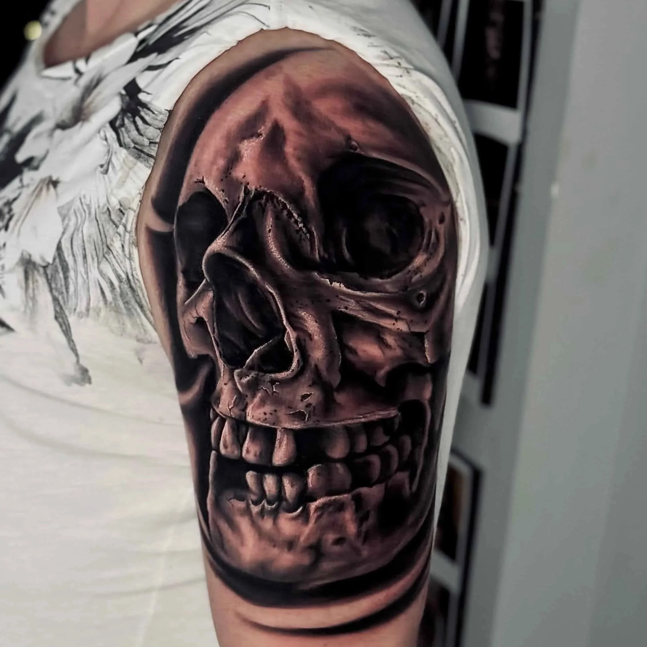 Image: Black and grey realism tattoo of a skull on the upper arm.